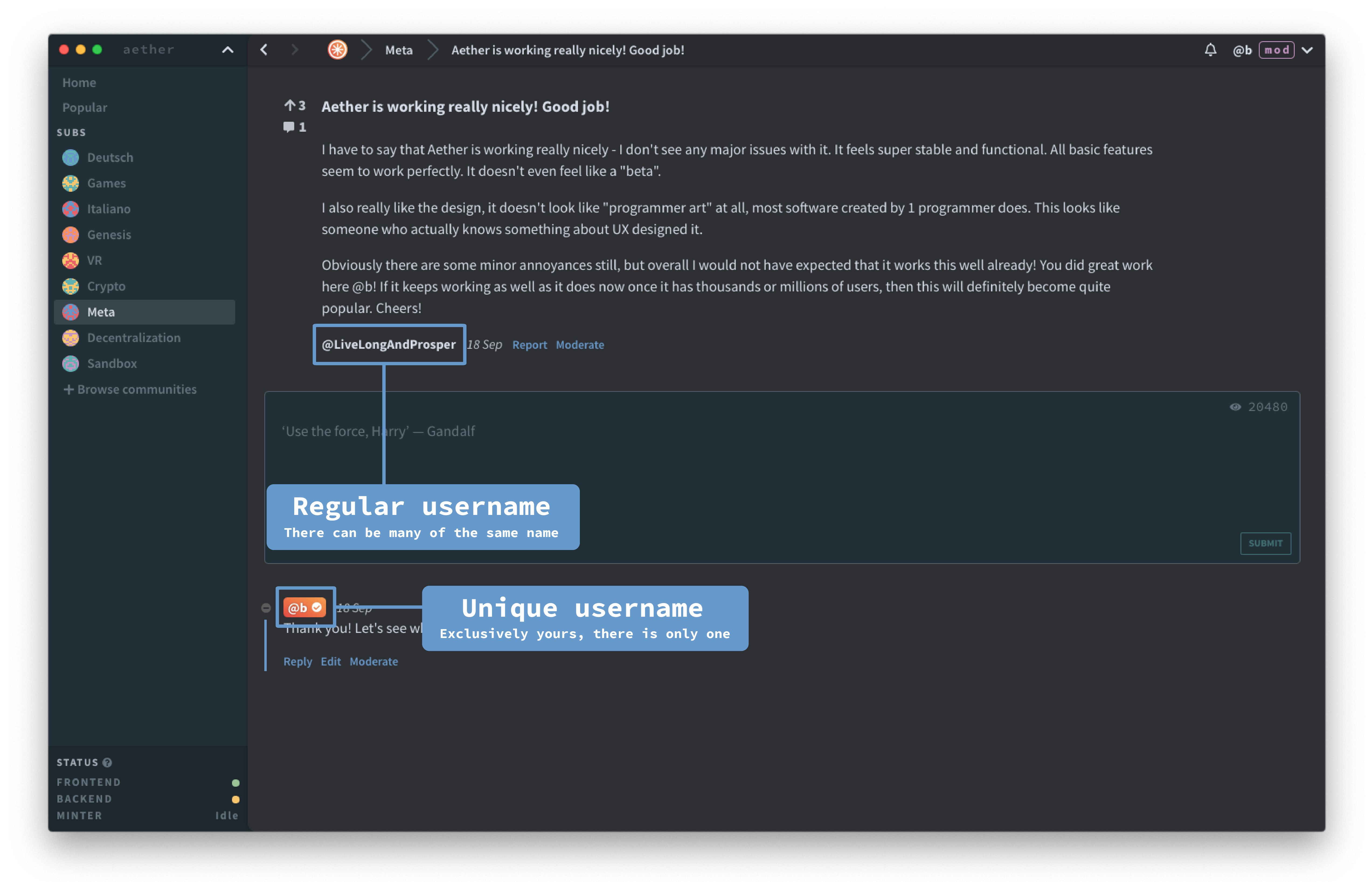 You want everything to be perfect and work all the time every time. Aether is a work in progress. It will break. You’re not purchasing a unique username, you are supporting me so that I can build Aether for all of us, and username is just a side benefit.